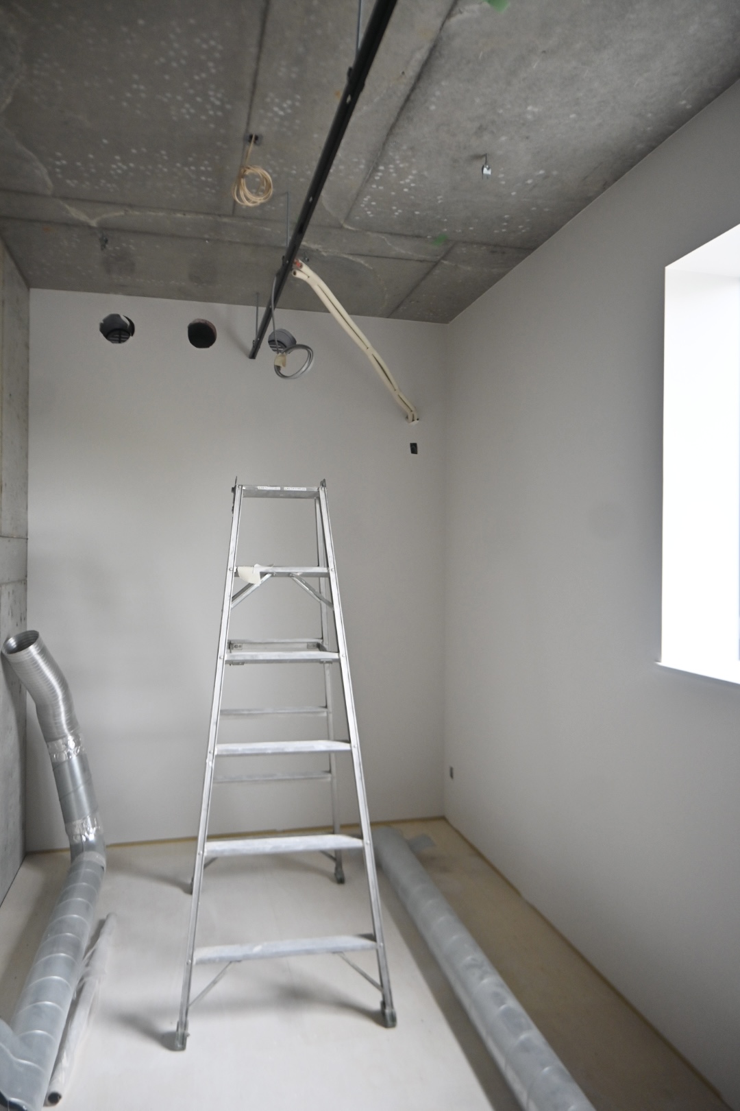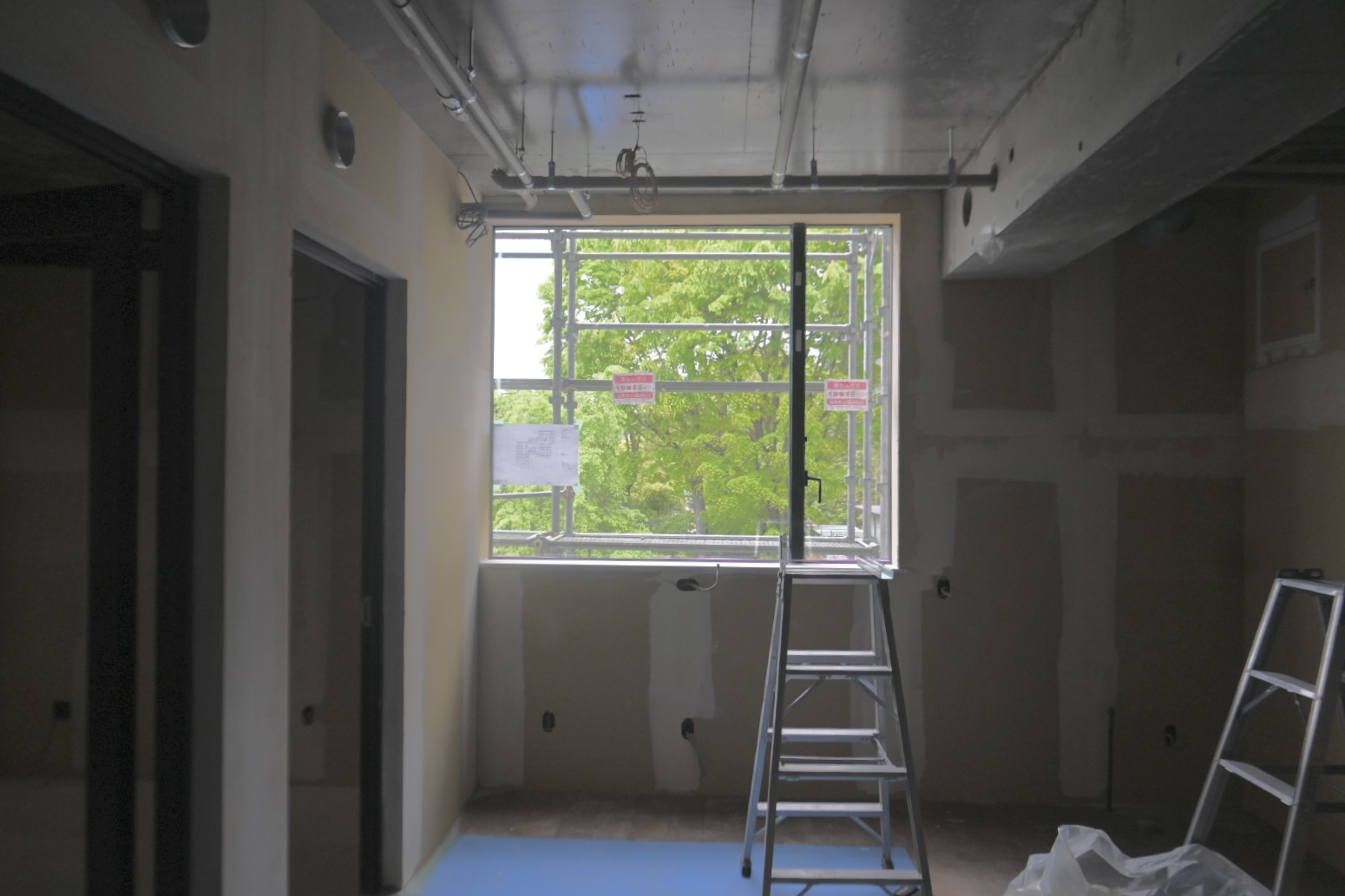シェアハウス部分の写真です。完成まではまだしばらくかかりますが、打ちっぱなしの壁と真っ白の壁紙、大きな窓から差し込む光とのコントラストですでに美しい佇まいです。