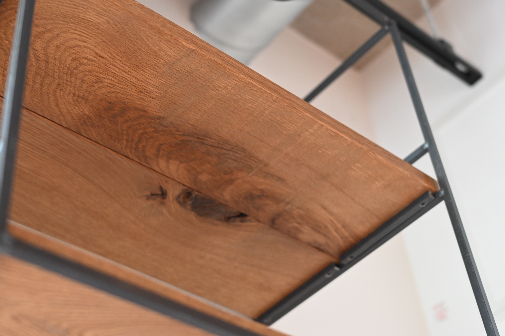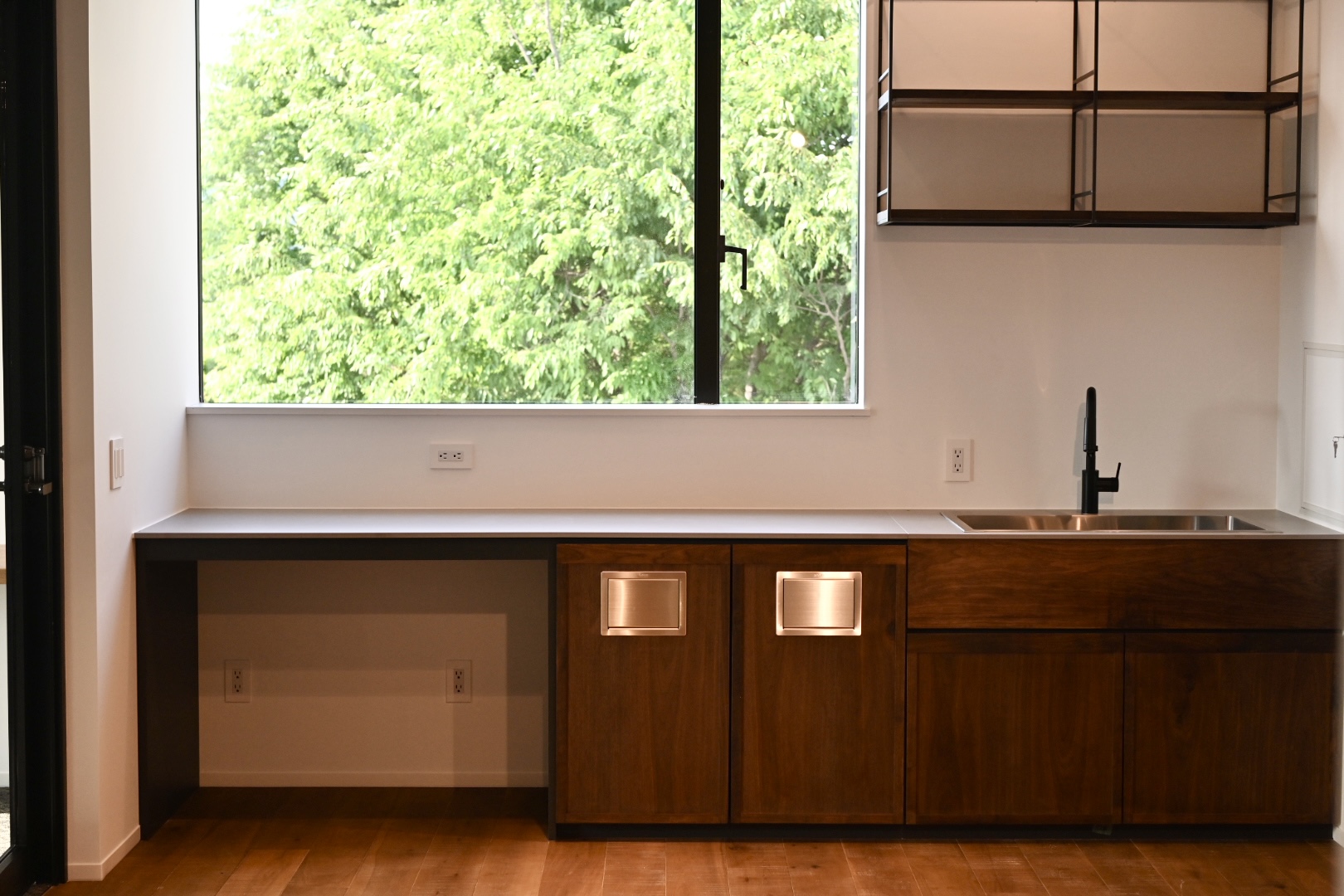 SQUAREの木材を使ったスタイリッシュでありながら自然のあたたかみを感じるオリジナルのキッチンとなっております。生き生きとした緑で彩られた窓と調和して素敵な空間です。共有部は完成までもう少し。